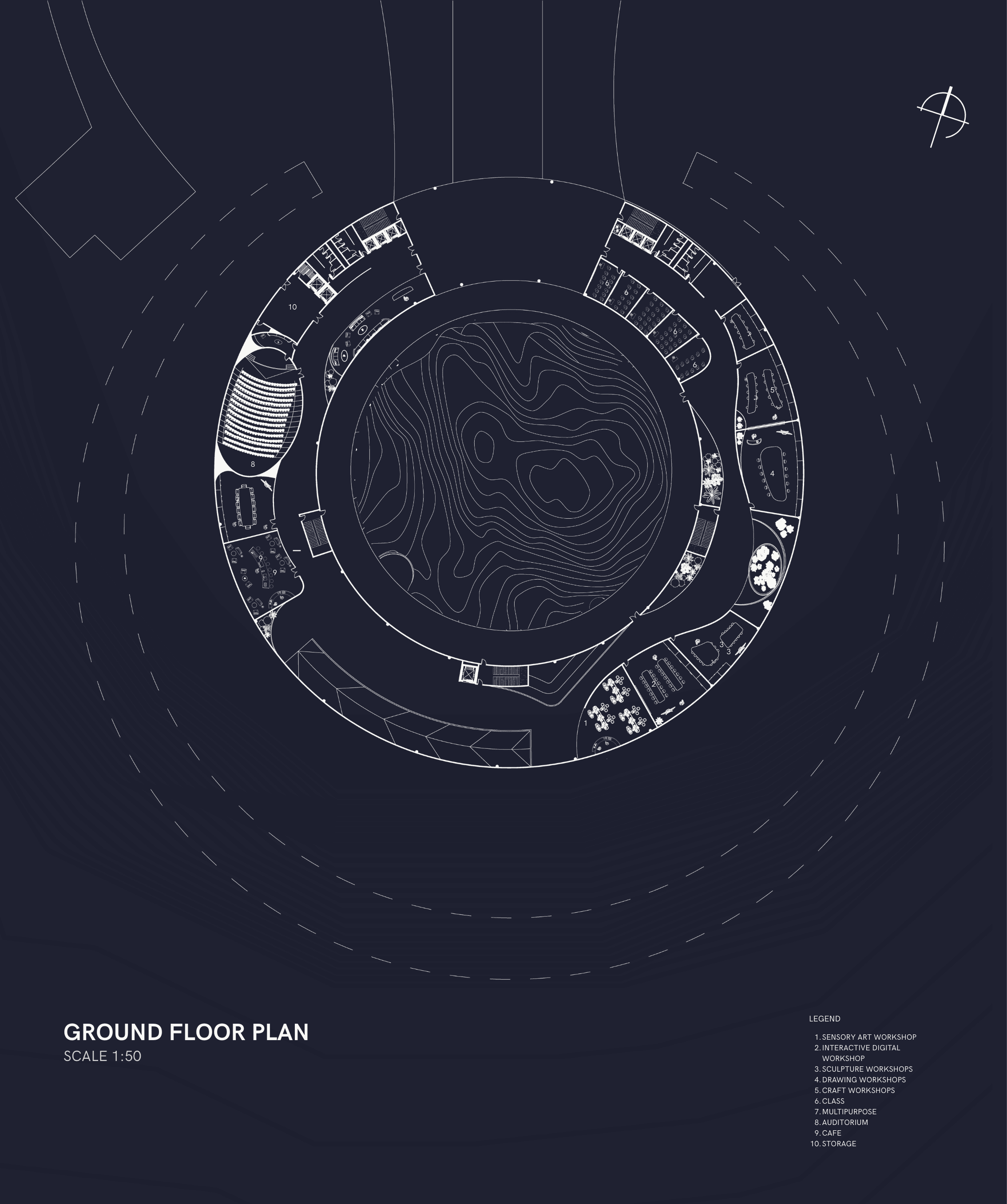 is a vibrant for artists to express themselves, featuring galleries for local and international talents. It offers interactive experiences and a unique design that respects the site's topography and climate. A connecting bridge enhances visitor engagement, while iconic aesthetics ensure every visit is filled with surprises. This project invites artists into a realm of inspiration and creativity.